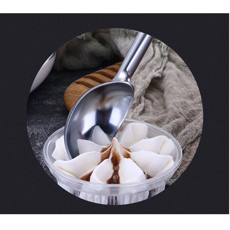 Бұл мырыш қорытпасынан жасалған балмұздақ шелегі ыңғайлы тұтқасы бар, жоғары сапалы мырыш қорытпасынан біркелкі құю арқылы жасалған, шөміштің өткір бұрыштары жоқ тегіс контурлы жиектері бар, бұл ыңғайлы, дөңгеленген ұстау тәжірибесін қамтамасыз етеді. Ұзындығы 16,5 см болғанымен, шелектің салмағы небәрі 75 граммды құрайды, біздің қолмен өңделген. жоғары температурада пісірілген қабатпен (120°C) қапталған, төзімді, бірақ қауырсын тәрізді жеңіл құрылымды жасайды. Шеңбердің басы мұздатылған балмұздақты оңай кесетін ерекше жобаланған 108 градустық сыртқы бұрышы бар ашық қайық пішінін қабылдайды. Шөміш басының екі жағында, иілген сызықтар негізгі теңізден төмен созылып, мұздауға мүмкіндік береді. кремді шығару. Бұл ойластырылған дизайн шеберлік деңгейіне қарамастан кез келген адам үшін қиындықсыз пайдалануды қамтамасыз етеді.